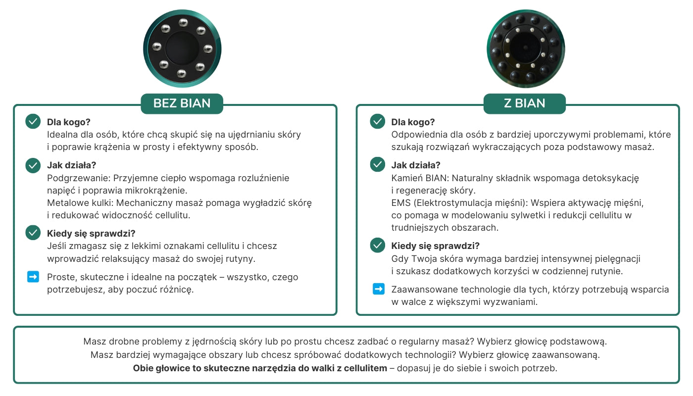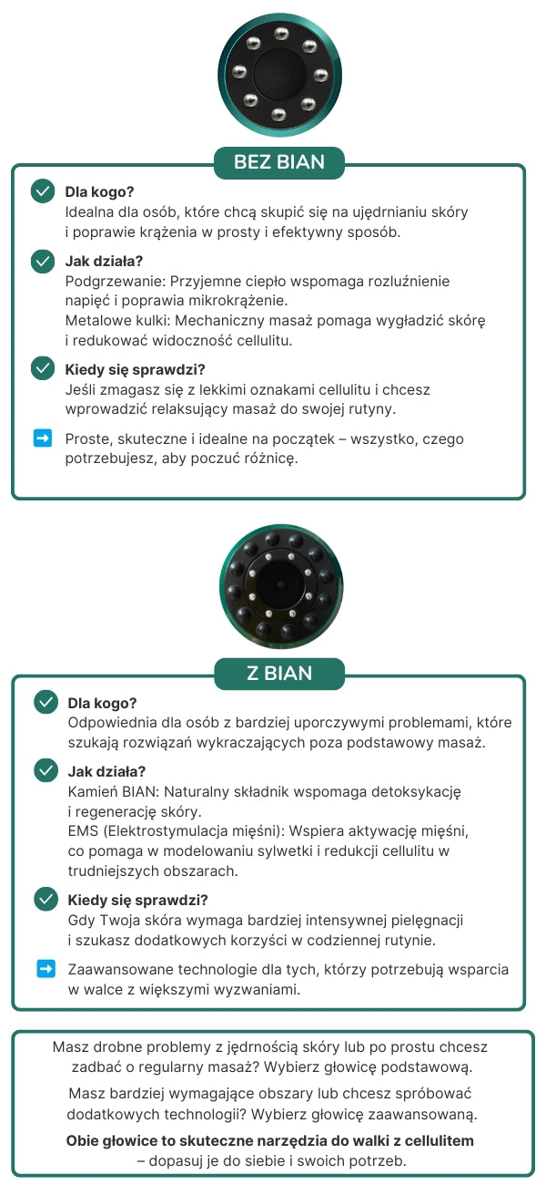 Tytanowe kulki: 8 tytanowych kulek umieszczonych w głowicy zapewnia mechaniczną stymulację podczas masażu Głęboki masaż tkanek, który rozbija złogi tłuszczu tworzące cellulit. Stały nacisk pomaga rozproszyć komórki tłuszczowe i wygładzić skórę.